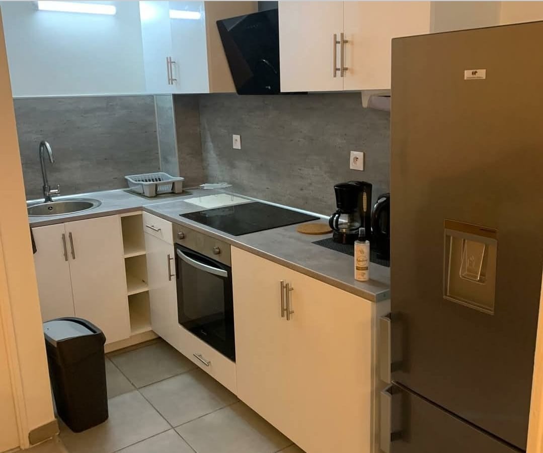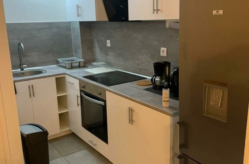 Une cuisine équipée (plaque électrique, réfrigérateur, micro-ondes, hotte)