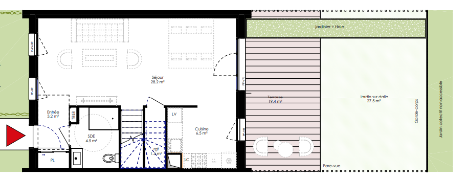 Terrasse : 19,4 m², Jardin sur dalle : 27,5 m², Extérieur total : 46,9 m², Jardin paysagé avec haie